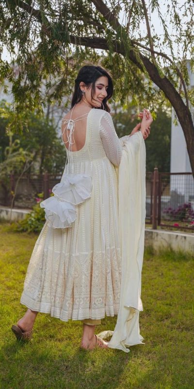 Wonderful Cream Color fox Georgette Embroidery Sequence Anarkali Gown