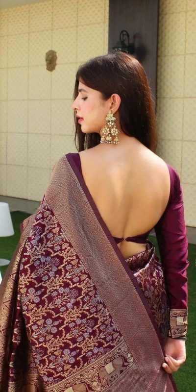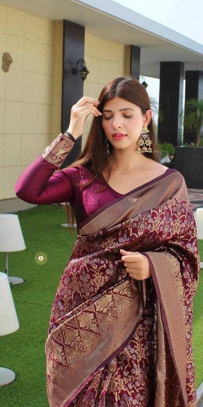 Wonderful Wine Color Soft Lichi Silk Jacquard Work On All Over Saree